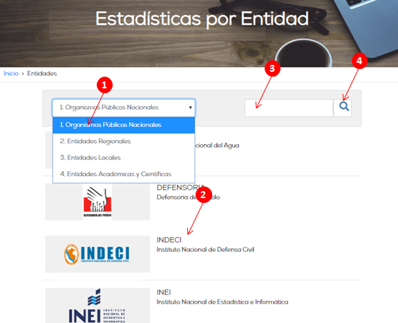 Al seleccionar un grupo, el sistema despliega la lista de entidades correspondientes al grupo seleccionado. Haga click sobre el nombre de la entidad(2).